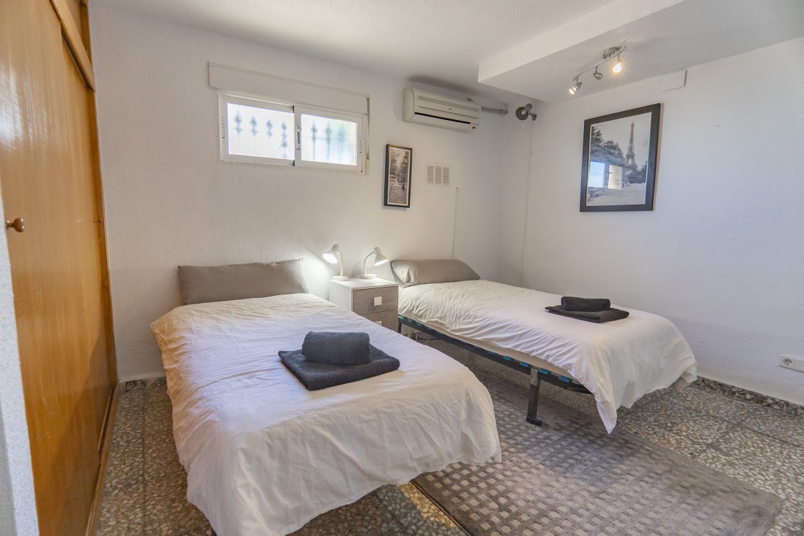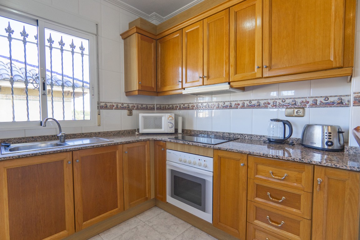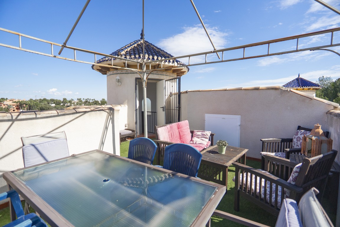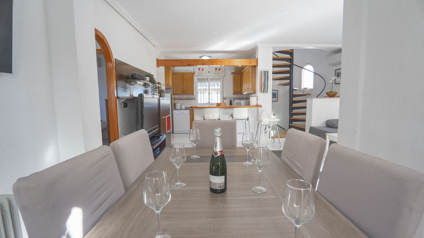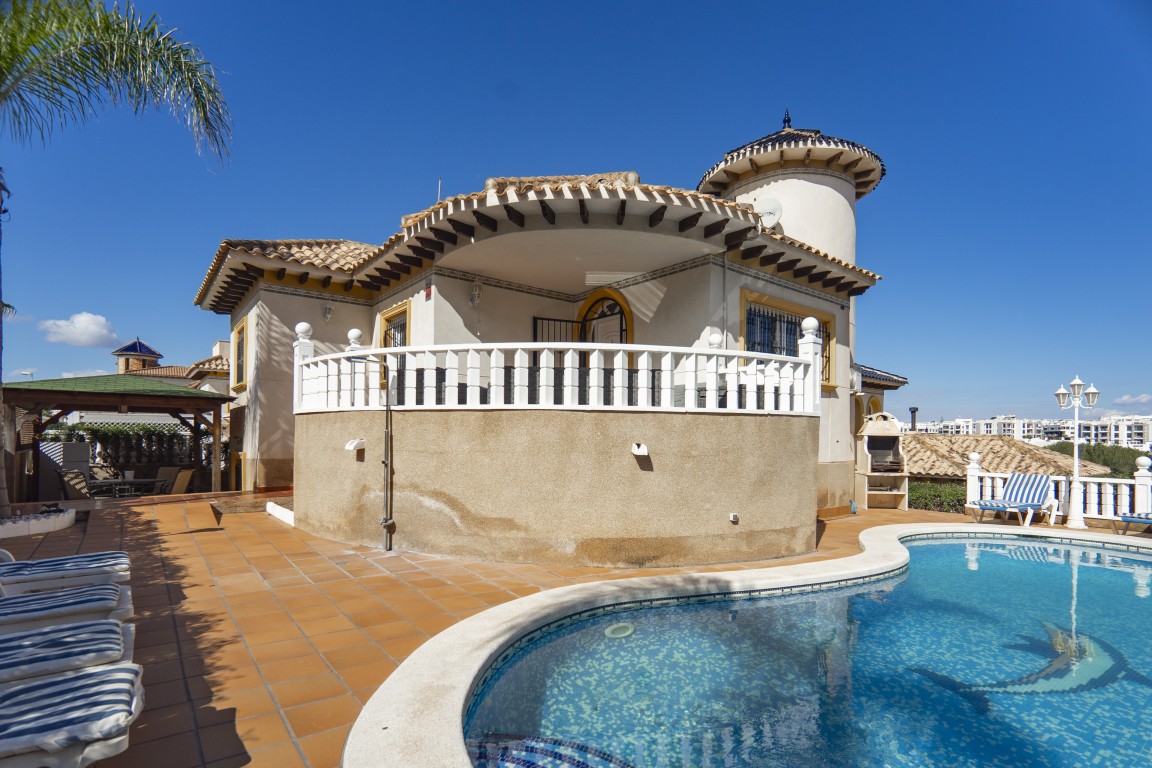 Four bedroom property with private pool overlooking the 5th tee of Villamartin Golf Course. The property has four bedrooms that sleeps 8, a large living area with open plan kitchen and stairs leading up to a private roof solarium. On the floor level there is a double bedroom with en suite bathroom and twin bedroom with a further family bathroom with a bath . Downstairs there is a further 2 twin bedrooms and a further bathroom with a shower enclosure. The property also has a large games room with bar area, Satellite TV & Wifi. There is a large outside area with BBQ and garden furniture inc sunbeds. Only 20 minute drive to Murcia Airport and 40 minutes from Alicante Airport This property is ideal for large groups or families that want to holiday together but want their own space. It is close to several Golf courses and all amenities. There is ample outside space from the decking area near the pool to the spacious roof solarium with amazing views over the Villamartin golf course. There is a games room with darts and table football table, TV and a bar. The Villa has a Tourist Licence and a proven history of rental income!